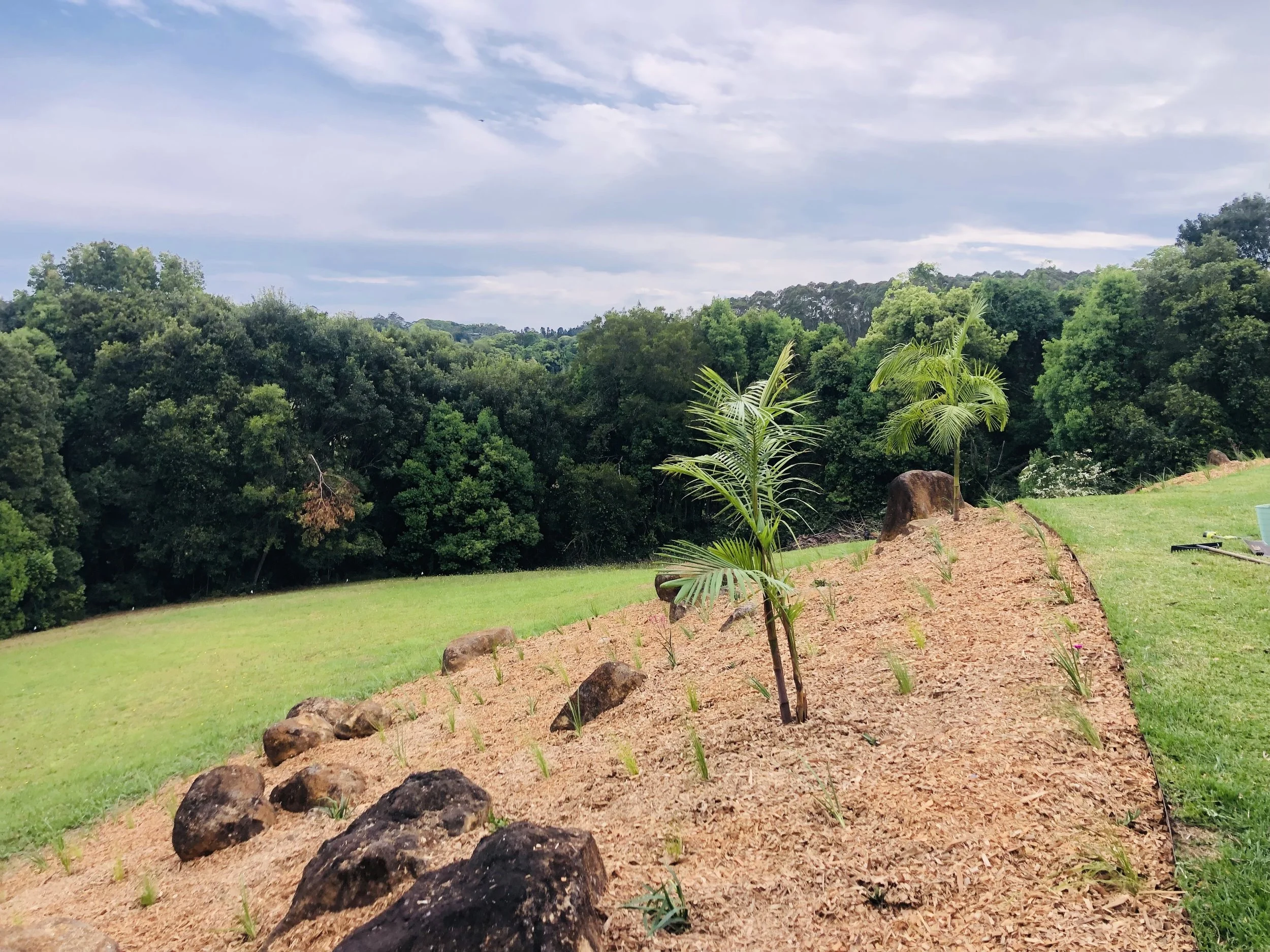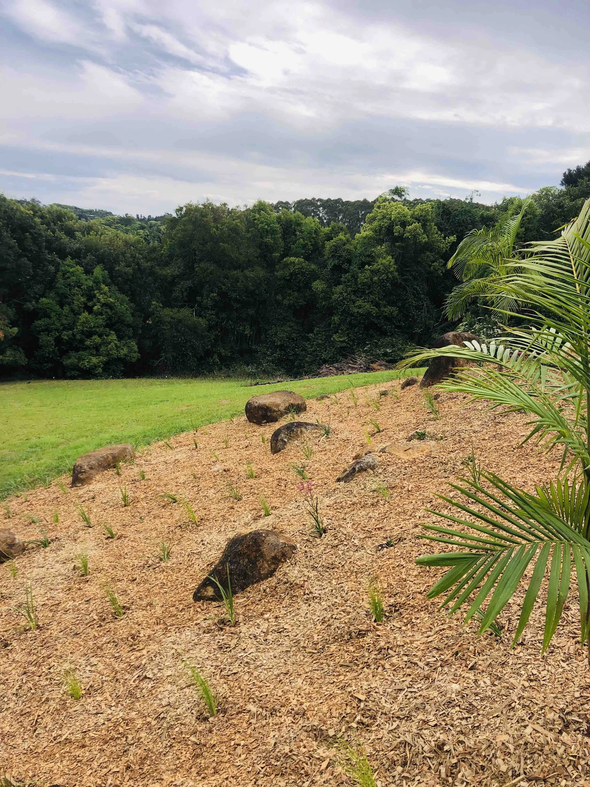 The steep and heavily weed covered areas of this property were previously unusable. By manually removing all invasive species without the use of any chemicals we are able to keep the soil relatively untouched. To give the client future erosion and weed control, we immediately planted over x1000 native clumping species. This beautiful variety of native grasses will offer perennial flowers, benefiting the rest of the property by attracting pollinators. All plants are grown in biodegradable pots, meaning there’s zero waste during this entire project. The rhizome roots of all selected plants help hold the steep banks together and the distance between each plant in this design will result in the understory canopies meeting and naturally suppressing invasive weeds. To finish this off we have covered any exposed soil in untreated hardwood chip; you’ll also see native Pigface planted throughout also, encouraging another flowering ground cover to crawl beneath and between.